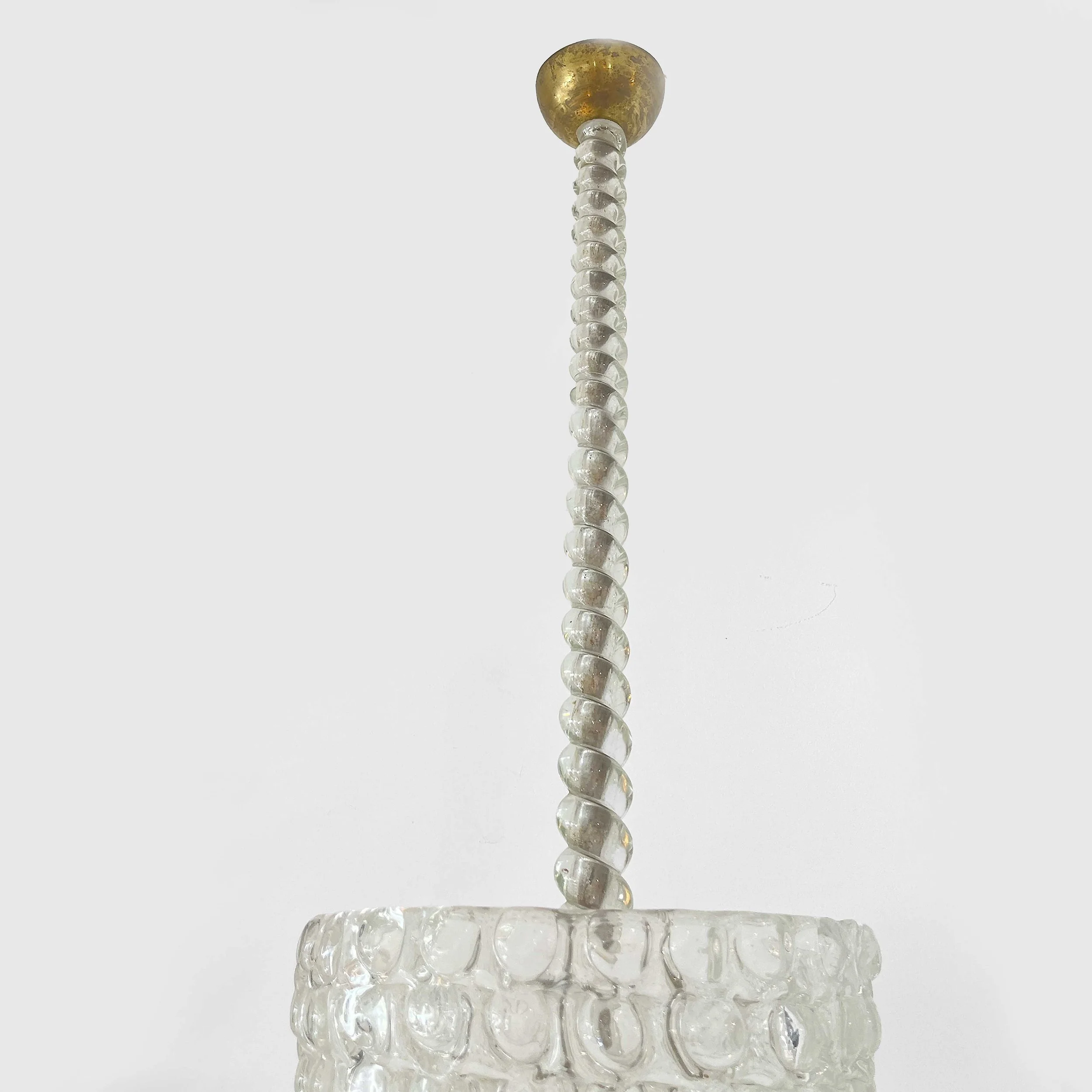 Ercole Barovier elegant and rare clear crystal glass chandelier with semi-spherical applications and glass stem. This crystal glass chandelier with thick fused lentils when lit emits a brilliant patterned light. Ercole Barovier 1940s Chandelier from 'Lenti’ Series.